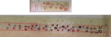 | T字の駒二つで一つのパーツになります。↑ ①赤線からカットして金具を付けて。 |