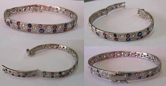 | 持込のダイヤ全部使ってブレスレト希望です、デザインはダイヤ枠をそのまま使っても使わなくても 大体のご希望を聞いてあとはお任せ頂きました。 赤点の3個入れダイヤ枠はそのままリング部分をカットして使いました。 |