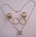 持ち込み、k18・プラチナ地金を使って加工依頼です。 @指輪のダイヤ7石使って・喜平のチェーンは下地金で 新規にカット小豆購入でペンダントトップ加工 A透かし蝶のペンダント、バチカンが大きいので小さめに加工 Bまる5角ルースを5本爪のペンダントヘットに加工しました |