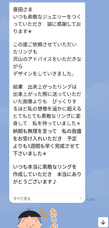 <ご依頼の方より感想を後日頂きました> 次回は私と主人の指輪、、できましたらよろしくお願い致しますm(._.)m笑笑 |