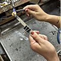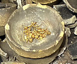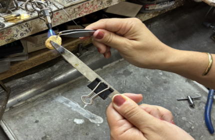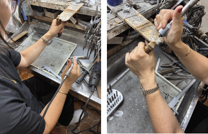 ロー付けする時は、k18塊が大きいので先に塊に熱を加えて ロー材が溶けは始めたら、バチカンを穴に差し込んでロー付け完了。 右手のブレスはユアーズ作品です。 |