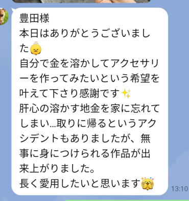 この度は長年に渡り加工依頼頂いてきましてありがとうございました。 沢山の作品を加工しましたが、ご希望に副えて良かったです。 Y様のオリジナル作品製作までご希望をお聞きして進めてきましたが どの作品も個性がありますので楽しく製作出来ました。 今までありがとうございました。 まだ、地金とダイヤが残りましたので又何時の日かご依頼を機会が出来ましたら お待ちしてますのでよろしくおねがいします。 |